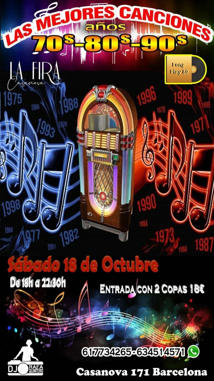 Las mejores canciones de nuestras vidas y de nuestras décadas favoritas que nos traen tantos recuerdos, todos los estilos en versiones originales. El mejor ambiente y más familiar de los tardeos de sábado en Barcelona, La Fira Casanova.